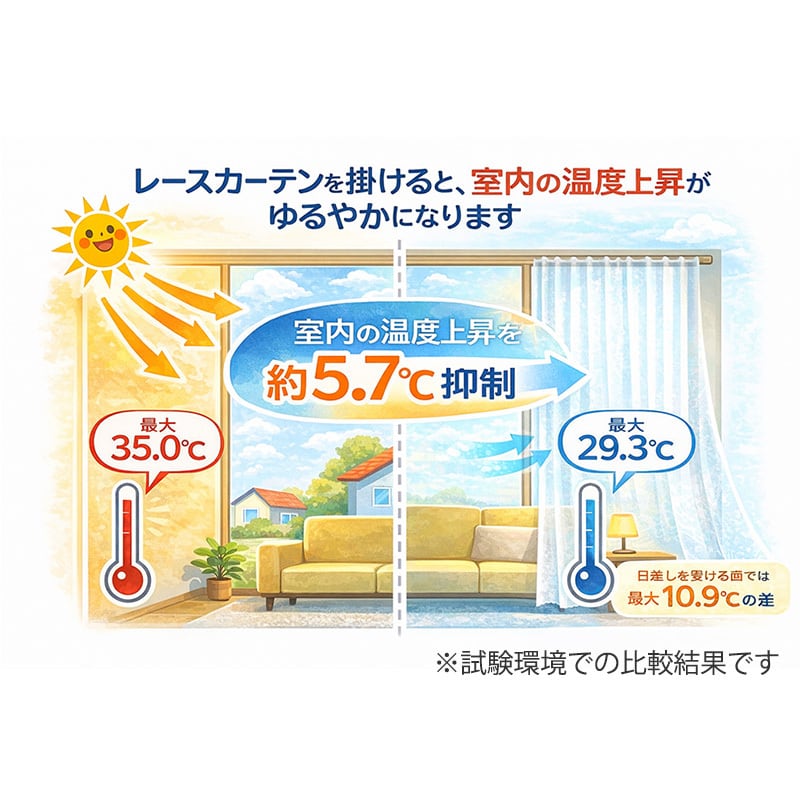 このカーテンは、試験環境での比較において、室内の温度上昇を約5.7℃抑える結果が出ています。